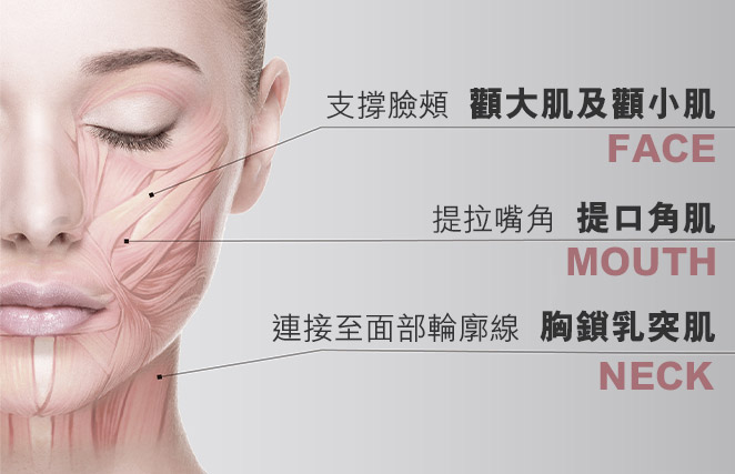 從臉頰、臉部輪廓線和法令紋等部位,到頸部、胸部、胸鎖乳突肌、
