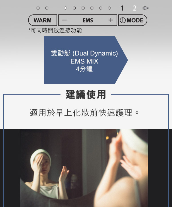 以輕拍肌膚表面的 EMS 技術為基礎,然後使用雙動態 EMS MIX 以兩種頻率 EMS 刺激並鍛鍊臉部肌肉。
