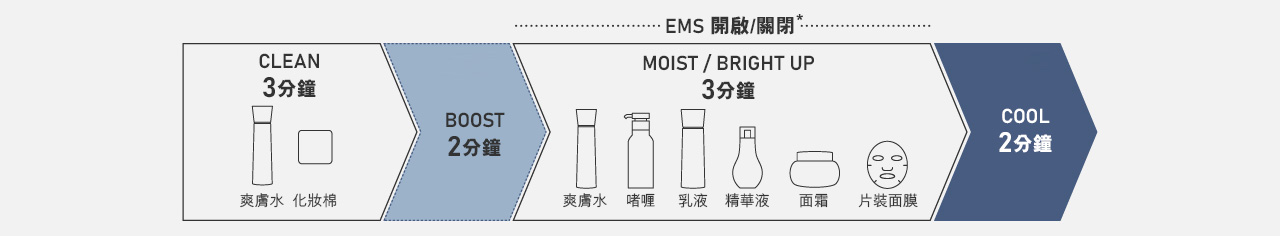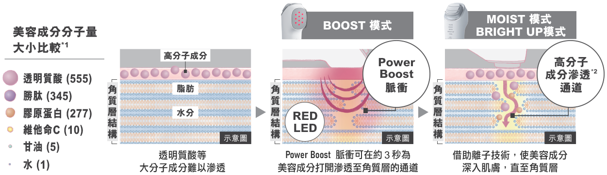 Power Boost 脈衝在約 3 秒內開闢讓美容成分滲透至角質層的通道,促進大分子美容成分滲透至角質層。RED LED 同時進行光療護理。使用「BOOST 模式」後,請立即進行 MOIST 或 BRIGHT UP 模式進行護理。
