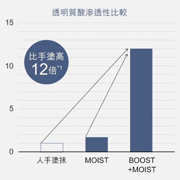 *1使用透明質酸水溶液實施滲透試驗。使用BOOST模式後與MOIST模式塗抹時及用手塗抹時的比較結果 (內部測試結果)。