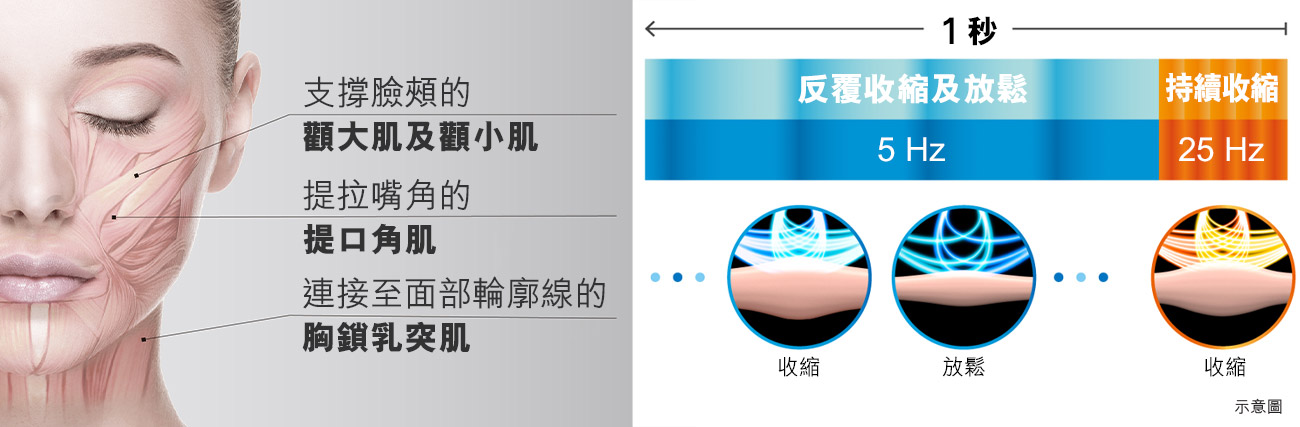 反覆收縮和放鬆肌肉的 5 Hz 與持續收縮的 25 Hz,提拉和緊緻肌肉。
