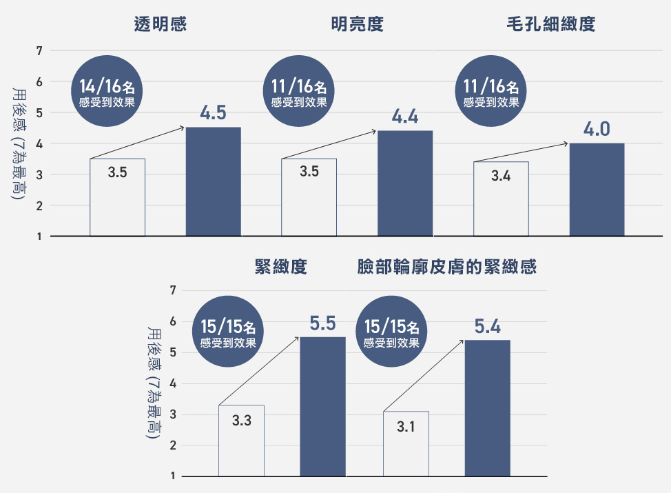 【測試部位】前臂【對象】8名30 - 50歲的男女。內部測試結果,效果因人而異。