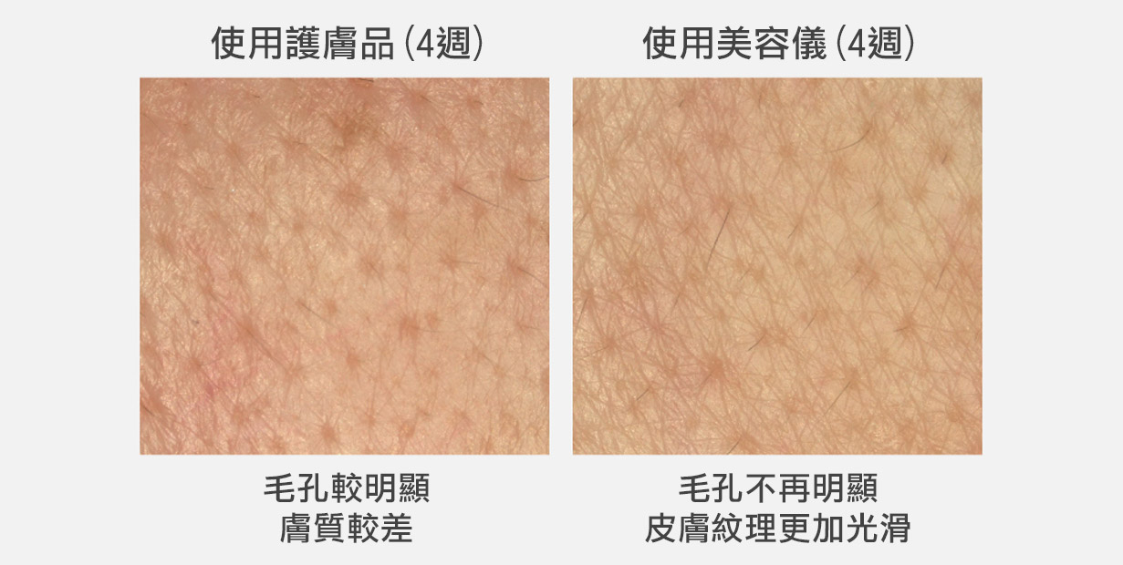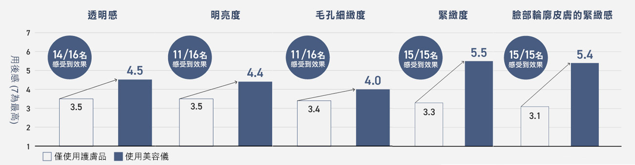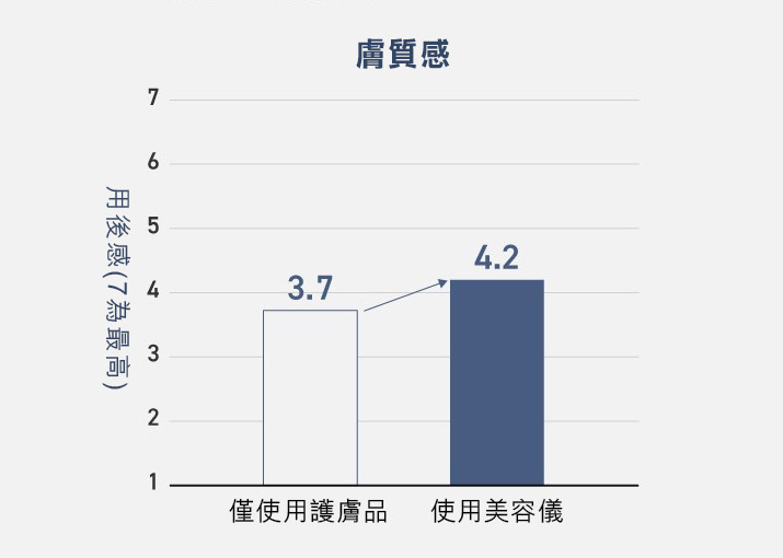 【測試方法】使用4周,使用化妝水及美容液,用手塗抹和使用美容儀的比較結果,使用CLEAN / BOOST / MOIST / COOL模式。